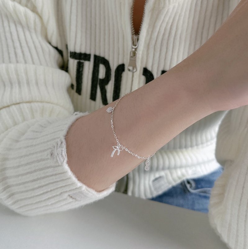 HB-99-D 鑲鑽垂吊四葉愛心蝴蝶結無限細銀手鍊